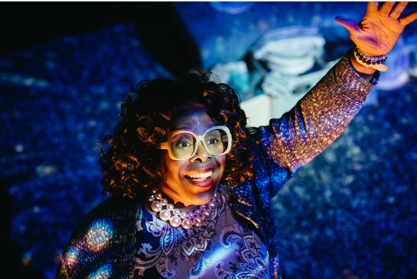 Image from the 2024 Players Club of Swarthmore production of Donna Orbits the Moon, featuring Annette Devitt as Donna, and directed by Suki.